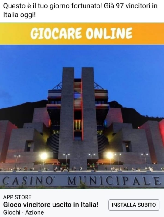 “Questo è il tuo giorno fortunato! Già 97 vincitori in Italia oggi!”. Lo si legge nel post sponsorizzato con il quale, su Facebook, si suggerisce di installare subito una nuova app di gioco. E l’immagine è inequivocabile: quella del Casinò Campione d’Italia, casa da gioco chiusa da luglio 2018 e della quale, non per la prima volta, viene utilizzata impropriamente e senza titolo l’immagine.