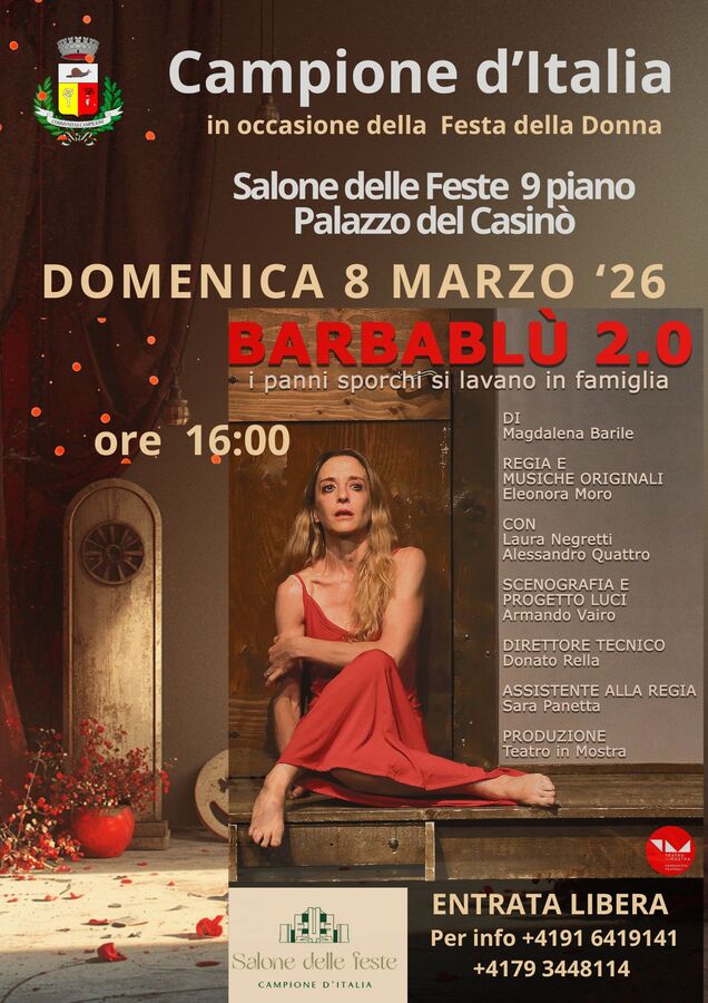 In occasione della Festa della donna, l’Amministrazione comunale di Campione d’Italia accoglierà domenica 8 marzo alle ore 16:00 – presso il Salone delle Feste al nono piano del Casinò di Campione d’Italia – lo spettacolo teatrale ‘Barbablù 2.0‘, produzione di Tim – Teatro in Mostra.