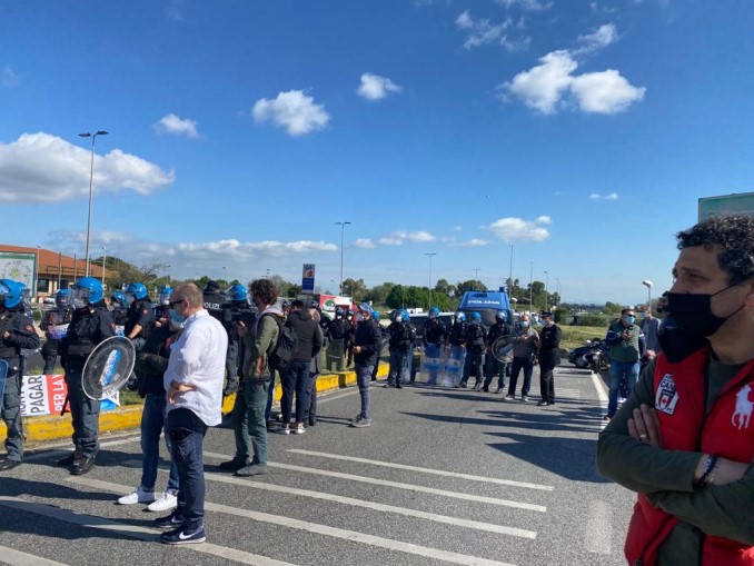 Le forze dell’ordine, più di 20 camionette, decine di agenti in tenuta antisommossa, hanno bloccato fin da subito i manifestanti iniziando a identificarli. Alcuni sono stati fermati all’uscita dell’autostrada, e probabilmente non riusciranno a raggiungere il gruppo; la maggior parte invece è ferma all’autogrill, dove lavoratori e imprenditori s’erano dati appuntamento per coordinare le operazioni.