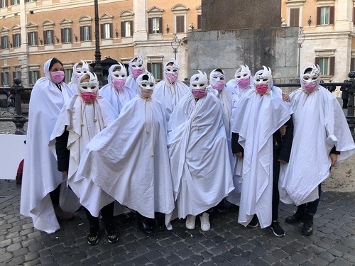Dopo le rose rosse e le velette nere, questa volta lavoratrici e imprenditrici – in piedi, una accanto all’altra, a distanza “di sicurezza” – hanno scelto di ricorrere a delle maschere di Carnevale in stile veneziano e a dei lenzuoli, per somigliare a dei fantasmi, a simboleggiare l’invisibilità che il comparto sembra rivestire per molta parte della politica nazionale, come richiamato anche da uno dei cartelli che campeggiano davanti all’obelisco del Parlamento: “150 mila invisibili del gioco legale”.