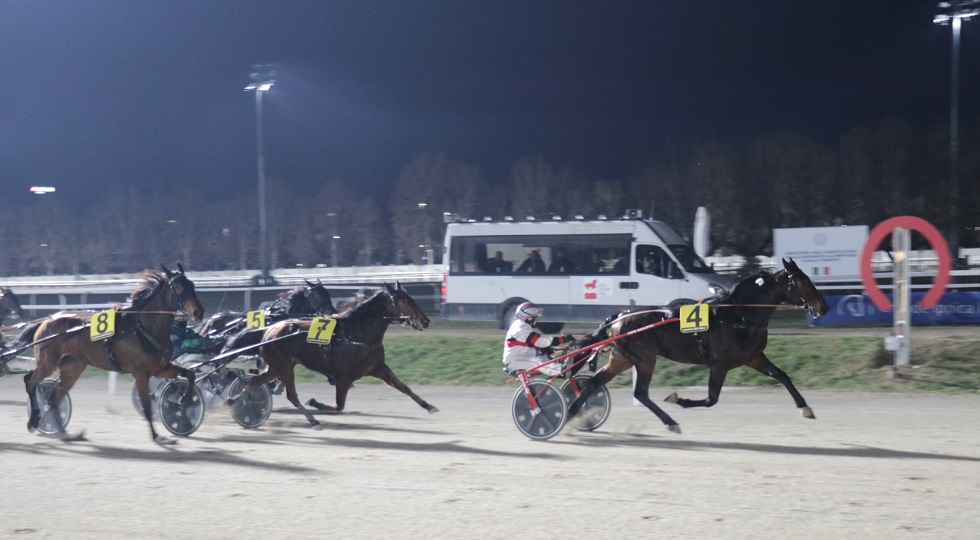 In chiusura, nel Premio Garland Nobel, arrivava il “botto” di inizio anno: lo sparava Esedomani, evidentemente declassatissima in categoria F. La cavalla di Marco Smorgon in testa si esprimeva a media di 1.12.2, dominando in lungo e in largo i rivali e ripagando il suo trainer/driver del boccone amaro mandato giù con Greenday. Zodiac Dany Grif provava a seguire la scatenata battistrada ma in retta accusava la fatica e così alle piazze andavano Antares Three e Dalila Grif.
