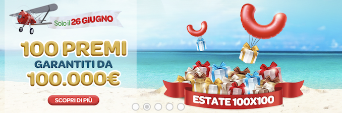 È stata presentata per l’incasso la vincita di uno dei premi assegnati nel concorso n.76 di sabato 26 giugno che ha distribuito in tutta Italia ben 100 premi garantiti da 100 mila euro ciascuno. Nel Lazio sono state realizzate 10 vincite: 8 nella provincia di Roma (di cui 5 nella capitale), 1 nella provincia di Viterbo e 1 nella provincia di Latina.