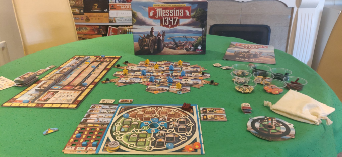 In Messina 1347 ogni giocatore incarna una importante famiglia messinese dell’epica. I signori della città lasciarono le loro abitazioni per trasferirsi in campagna, sperando così di evitare il contagio. Nella sua accezione didattica il gioco ricorda che, mentre si spostano, le famiglie cittadine spesso tentavano anche sul salvataggio di altre persone, lo stesso deve fare il giocatore nel gioco, così come devono cercare di vivere bene nella residenza di campagna insieme agli ospiti salvati durante il tragitto. Tutto ciò in attesa che la pandemia allenti la presa, consentendo a ognuni signoria di tornare a Messina e prendere il dominio di quartieri cittadini.