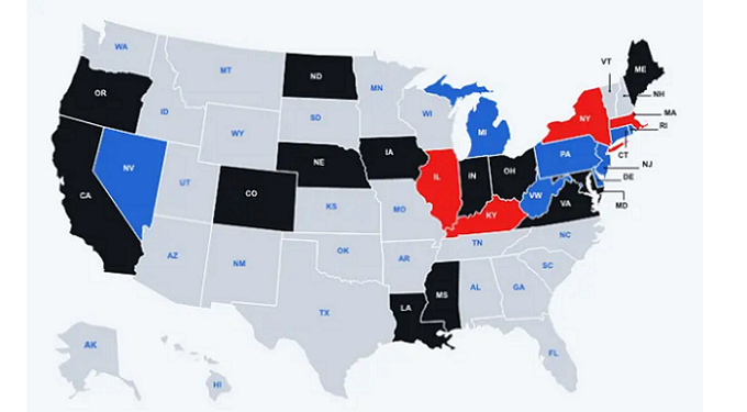 Veniamo agli stati "neri", dove si è discusso di regolamentare il poker online, ma le tante opposizioni hanno portato a uno stallo che si protrae da tempo. E sono numerosi: California, Oregon, Colorado, Nebraska e North Dakota, Iowa, Louisiana, Mississippi, Indiana, Ohio, Maryland, Maine e Virginia.