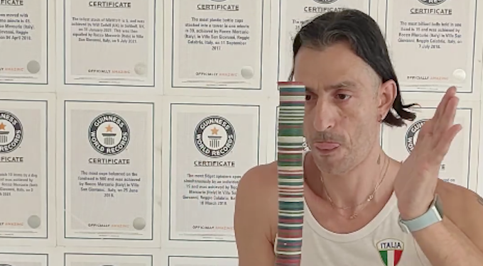 È italiano e si chiama Rocco Mercurio ed è di Villa San Giovanni, Reggio Calabria. È entrato nel Guinness World Record per aver tenuto in equilibrio su un dito non 10 o 20 ma ben 255 poker chip. Il record non è recentissimo ma del 15 maggio scorso anche se sul profilo Instagram dei record mondiali è apparso appena 4 giorni fa.