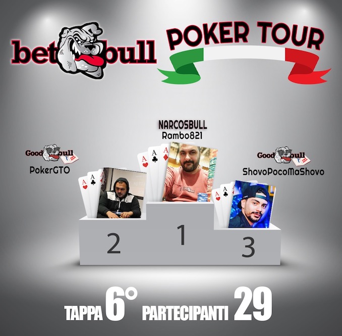 Il team Narcosbull con Francesco Perrupato ha trionfato nella sesta tappa del Betbull Poker Tour, il podio è del Goodbullteam.