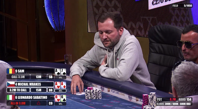 Peccato, invece, per Mario Ripepi, player umbro con diverse centinaia di migliaia di dollari vinti carrier che forse non è riuscito a gestire il suo ottimo stack splashando in all in contro il romeno SAM che snap calla con una coppia di 8 e riduce l’azzurro ai minimi termini. Eppure Mario aveva iniziato il feature table a 27 left con grande decisione senza perdere un colpo. Ottima edge e capacità di mettere pressione senza rischiare. Poi, tornato al tavolo finale sempre con un ottimo stack, perde una mano contro il romeno e poi decide di 3bettare ancora e SAM flatta, stavolta con coppia di 8 contro AQs a quadri di Ripepi. Si scopre tutto il board e la gerarchia della mano non cambia e Mario decide di mandare tutto sul river, parliamo di 14-15 milioni e viene snap callato dal romeno che sale a circa 30 milioni. L’italiano rimane con 1,2 milioni e poi esce. Un pizzico di rammarico dovrà pur esserci visto che, nel frattempo, anche Mrakes compie qualche errore ma, alla fine, riesce sempre a non compromettere tutto lo stack. Una dinamica standard, potremmo dire, ma comunque particolare, vede il ceco, poco dopo l’uscita di Ripepi, shovare in bvb con 9 e 6 contro il polacco Muzacz che aveva complicato da piccolo buio con KK. Mrakes scende sugli 11 milioni.