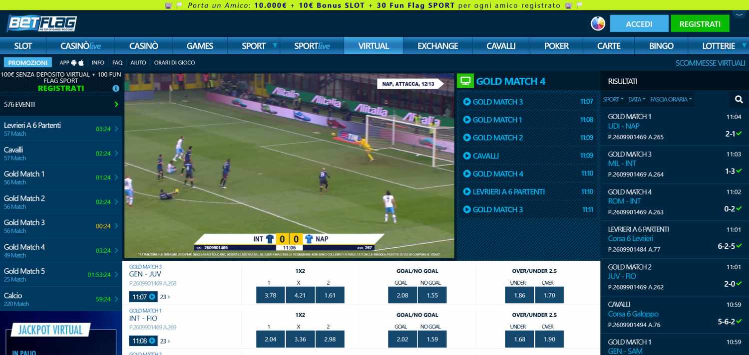 - Discipline disponibili: calcio virtuale, corse di cavalli e levrieri, tennis e basket;